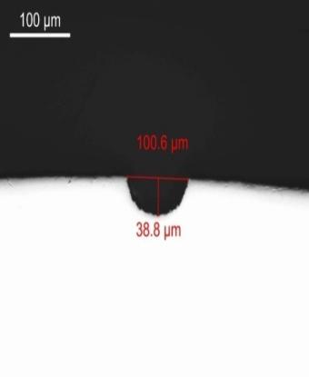 在管材的生產過程中,需要采用超聲檢測對產品進行檢驗,以剔除不滿足要求的管材。而確定產品是否合格的標準,是通過在管材上制作規定尺寸特征量值的人工槽型標準傷,進行超聲設備靈敏度調試,確定檢驗標準。檢測中將缺陷所產生的反應幅度與人工槽型標準傷產生的反應幅度進行比較,如果低于人工槽型標準傷反應幅度,產品將判定為合格而放行。人工槽型標準傷是判定產品是否合格的主要依據和判定標準,其尺寸精度至關重要,直接影響產品檢驗結果。在無損檢測過程中主要以長度、寬度和深度來表征人工槽型標準傷的特性量值。人工槽型標準傷一般在管材的內外表面加工,圖1為公司加工的無損檢測人工槽型標準傷的3D成像圖,垂直于人工槽型標準傷長度方向的截面圖如圖2所示。由圖可以看出加工出的人工槽型標準傷規整、對稱,為典型的U型形狀。
