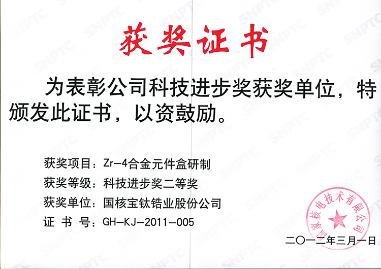 國核寶鈦鋯業(yè)股份公司《Zr-4合金元件盒研制》獲2011年度國家核電技術(shù)公司科技進步二等獎