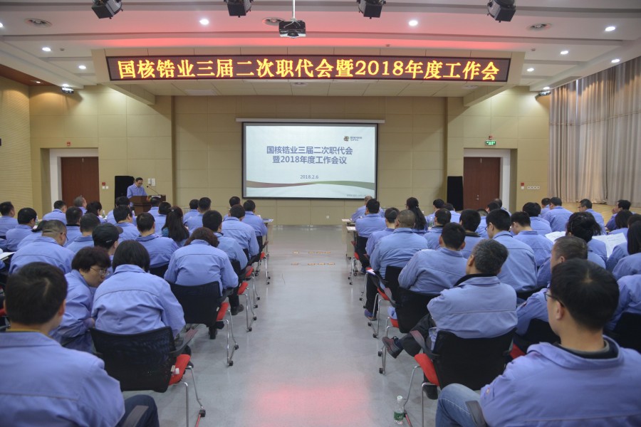 會上,總經理袁改煥做了題為《改革奮進新時代、凝心聚力展作為——共創鋯業發展新輝煌》的工作報告。報告指出,2018年公司要在黨的十九大精神指引下,全面貫徹落實國家電投、國家核電年終工作會議、黨建及黨風廉政建設工作會議精神。報告從完成戰略規劃升版落地、為中長期發展注入新能量;大力推進改革,持續提升企業管理水平;深化體系建設,實現安全質量管理水平穩步提升;優化“大市場”體系,實現基本、增值、衍生業務新突破;夯實“大生產體系”,確保重點生產任務順利完成;突出重點,著力推動科技創新成果的國產化應用;持續抓好重點投資項目建設管理;優化激勵機制,打造過硬團隊等十個方面,部署了公司2018年工作任務,提出建設具有全球核心競爭力的世界一流企業,共創國核鋯業發展新輝煌的目標和要求。