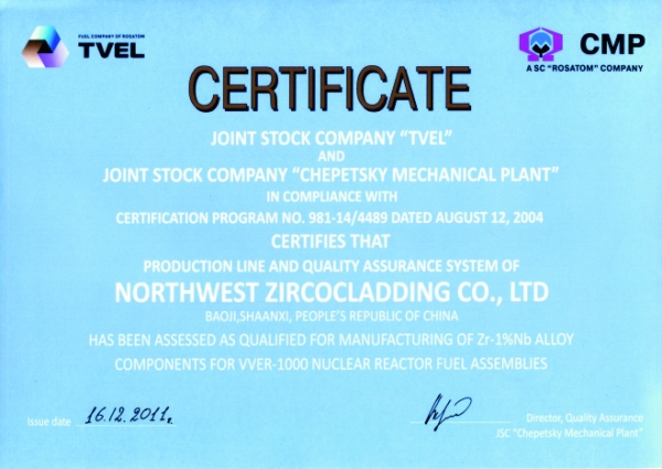 國核鋯業(yè)獲得西屋電氣公司頒發(fā)的AP1000核級鋯材生產(chǎn)線鑒定證書